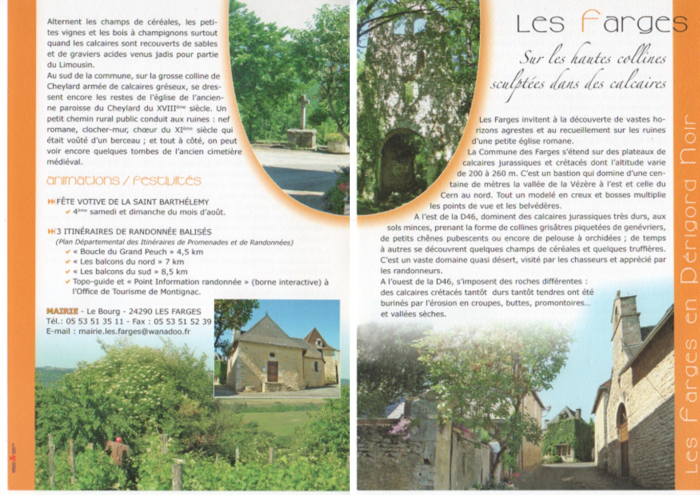 “L’histoire des Farges commence au Cheylard”, c’est ainsi que commence le livre de Paulette Fourniau, “Les Farges, une communauté rurale en Périgord Noir”, publié aux éditions “Les Indes Savantes”, en vente à la mairie. C’est un document fondamental qui retrace la vie des Farges des origines à nos jours.